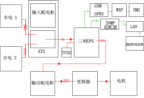 對鋼鐵企業信息中心,推薦采用UPS的雙回路冗余供電系統,具有高度容錯的能力,可以杜絕單點故障隱患。恩億梯UPS雙回路冗余供電系統,采用2臺三進三出大功率UPS組成1+1并聯冗余系統輸出,作為負載設備的主電源輸入,1路市電(也可以是另一路UPS)作為負載設備的備用電源輸入。對于雙電源負載設備,可以直接接入二路輸入,分別來自UPS并機系統和市電回路,提高供電保障;對于單電源負載設備,在其前端配置冗余開關,利用冗余開關的冗余配電功能提高供電可靠性——冗余開關具有二個輸入端子,一個輸出端子,只要保證有一路輸入,輸出就不會中斷。此種應用,當主回路供電系統供電中斷時,負載設備切換至由備用電源回路供電;從而大大提高了負載設備的供電可靠性,全面保護整個鋼鐵企業信息中心的的各種硬件設備、運行程序和數據及數據的傳輸。