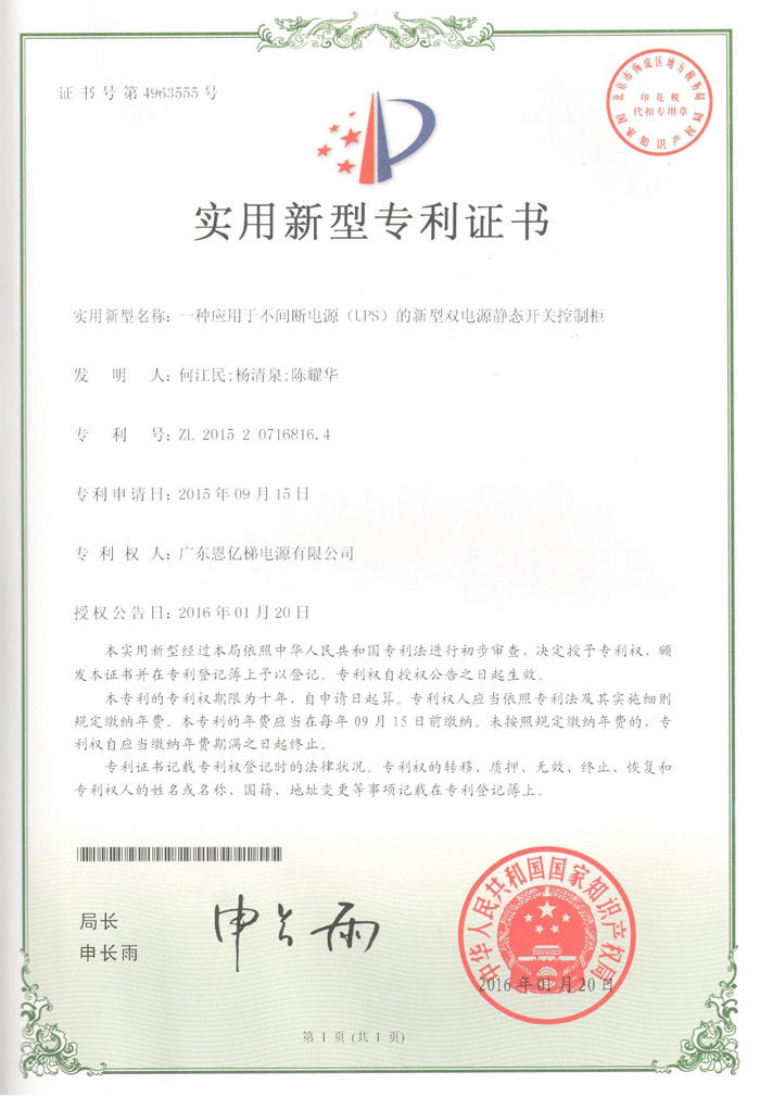 專利證書(一種應用于UPS的新型雙電源靜態開關控制柜)